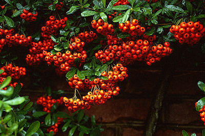 Pyracantha is an evergreen shrub known for its colorful berries in the fall and winter.