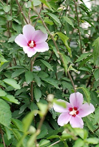 Hibiscus syriacus is a deciduous shrub or small tree, growing up to 10 feet tall and wide, with dark green foliage and flowers in shades of pink, blue, lavender, and white.